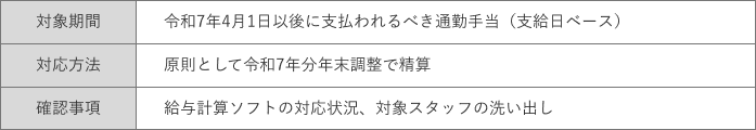 今回の改正で最も注意すべき点は、「令和7年4月1日以後に支払われるべき通勤手当」から適用されるという点です。