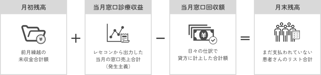 日々の窓口処理が正しく行われているかは、月末に以下の計算式で検証できます。